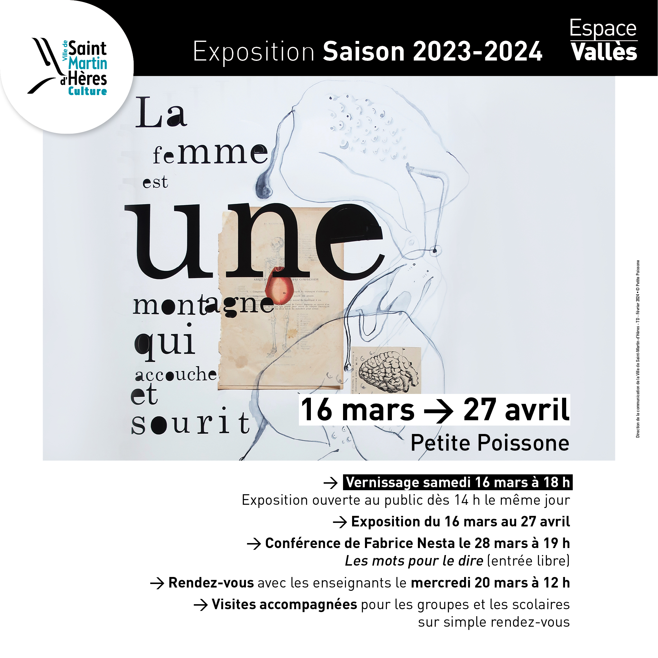 Rendez-vous à l’Espace Vallès samedi 16 mars à 18 h pour assister au vernissage de l’exposition « La femme est une montagne qui accouche et sourit » de Petite Poissonne.