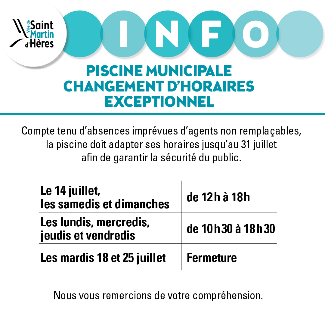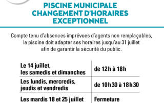 Compte tenu d'absences imprévues d'agents non remplaçables, la piscine doit adapter ses horaires d'ouverture afin de garantir la sécurité des nageurs.