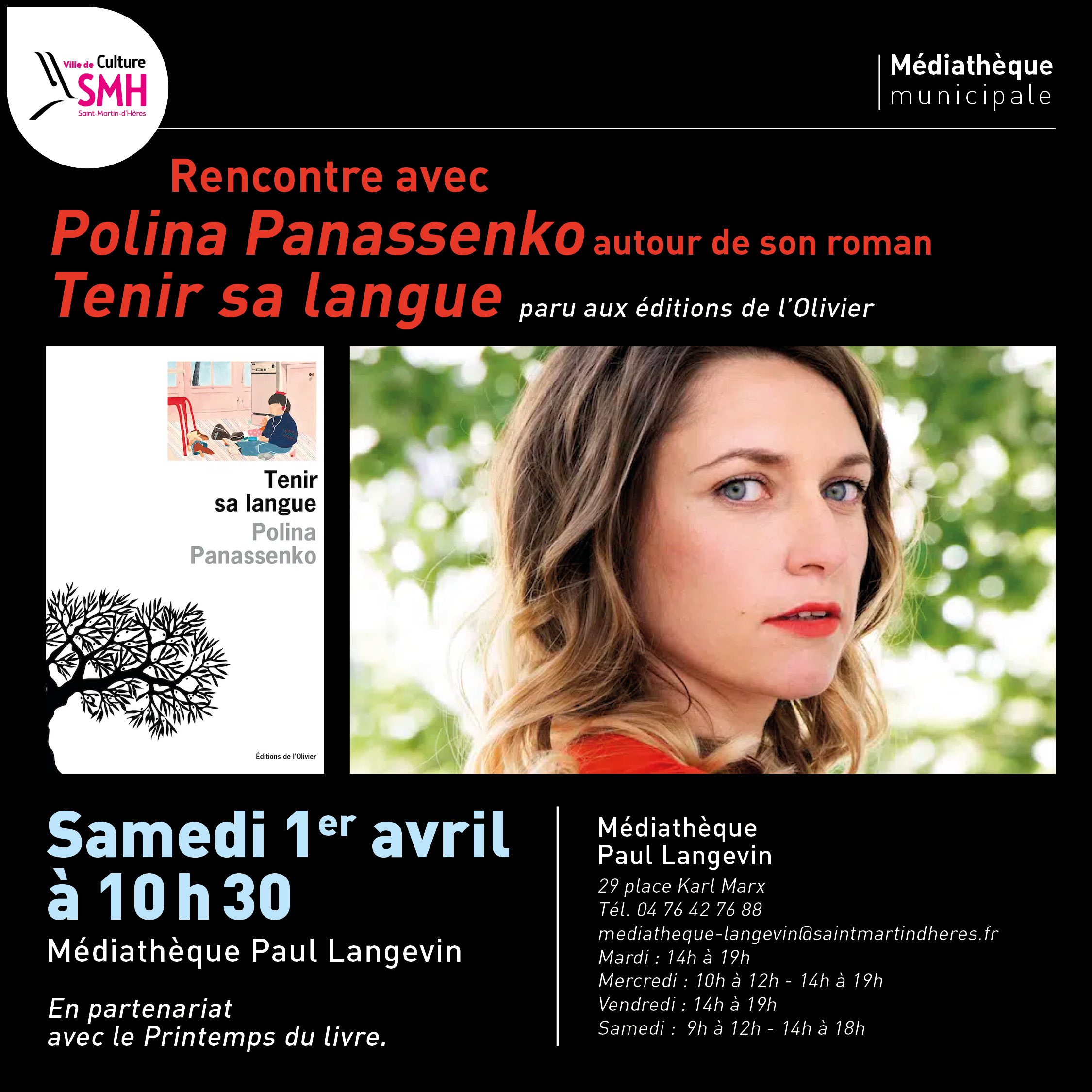 Dans le cadre de la 21ᵉ édition du Printemps du livre, organisée par la ville de Grenoble et portée par la bibliothèque municipale, la médiathèque Paul Langevin accueillera l’autrice Polina Panassenko samedi 1er avril à 10 h 30. L'auteure, traductrice et comédienne russo-française présentera son premier roman « Tenir sa langue » paru aux éditions [...]
