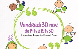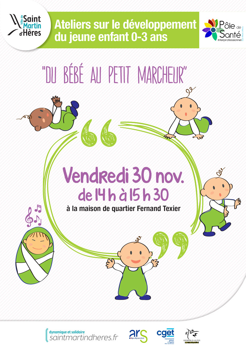 Rendez-vous vendredi 30 novembre 2018 de 14h à 15h30 pour participer à des ateliers ouverts aux futurs parents (sans présence d'enfants), animés par des professionnels de la santé. Au programme : étapes motrices vécues par le bébé jusqu'à la marche, matériel pour l'accompagner, gestes qui favorisent son développement... Renseignements : Maison de quartier Fernand Texier [...]