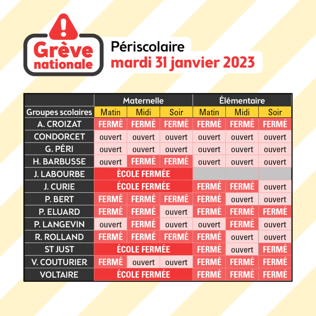 ❗️ C’est grève nationale ce mardi 31 janvier❗️Voici l’état de grève des services périscolaire de la ville 🏫.